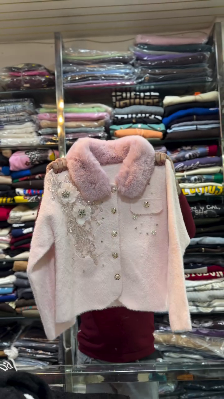 Wrap yourself in winter wonder with Frosted Bloom πŸŒΈβ„οΈβ€”a light pink jacket adorned with ornate embellishments 🌺✨. Featuring a plush fur collar 🧸, floral appliquΓ©s 🌼, lace details 🧡, and delicate beadwork πŸ’Ž, this piece is a celebration of craftsmanship and couture.