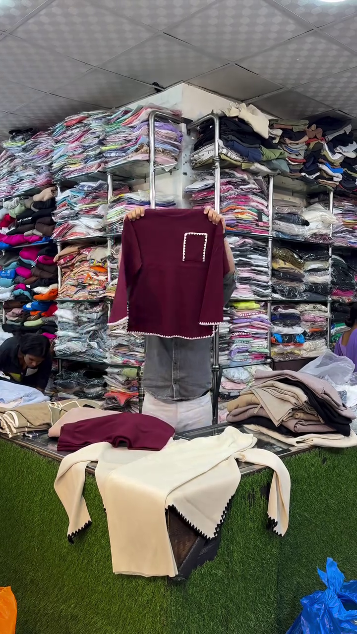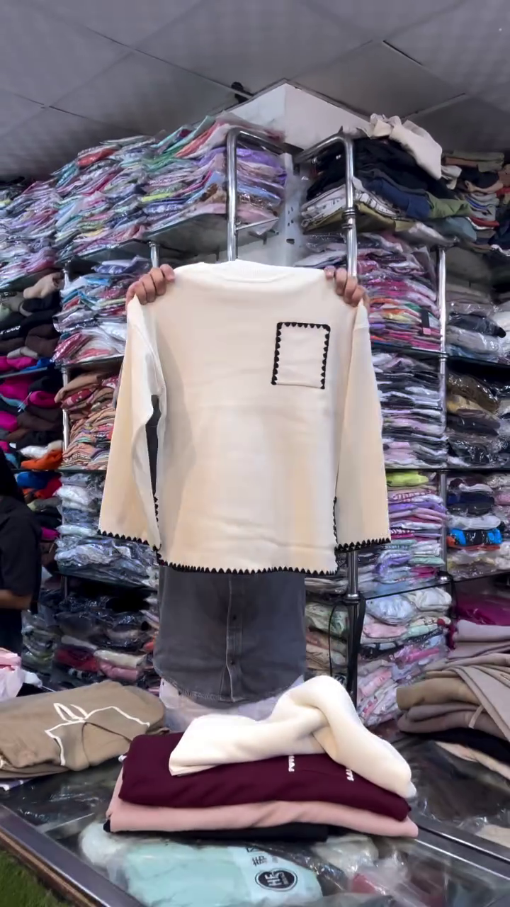 🧵 “Minimalist Modern Café Cream Knit Top with Artistic Black Scalloped Accents and Pocket Detail for Everyday Sophistication Seekers” 🧵