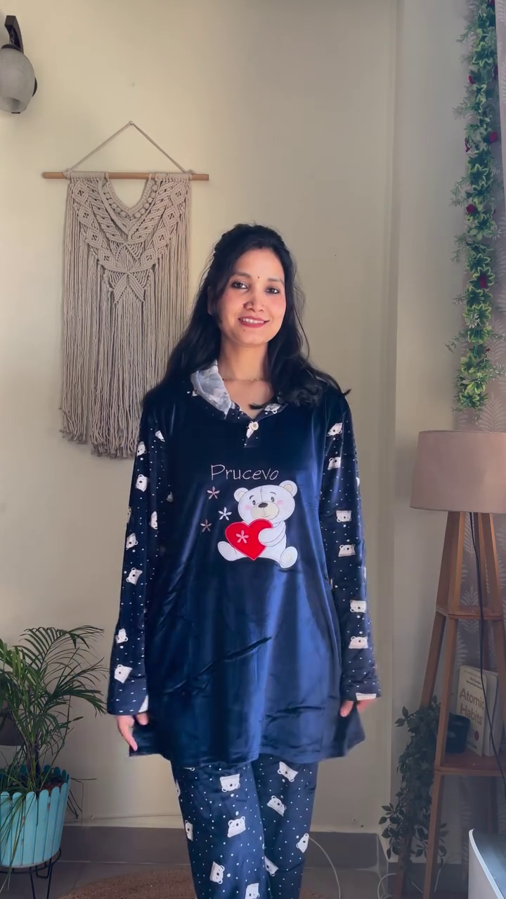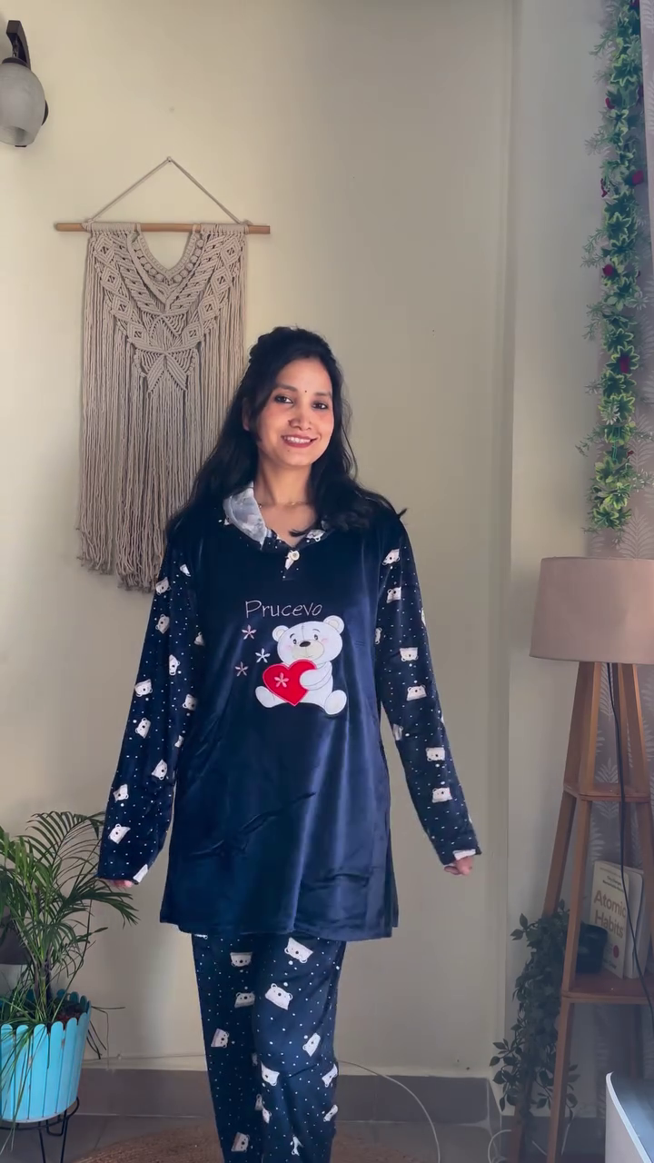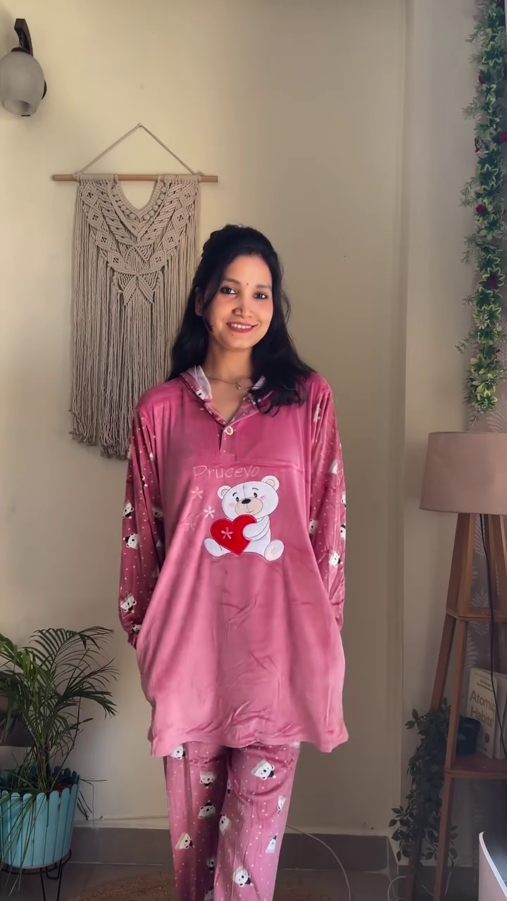 ๐งธ Adorable Bear Print Buttoned Pink Velvet Pajama Co-ord Set โ Ultra-Soft Winter Nightwear