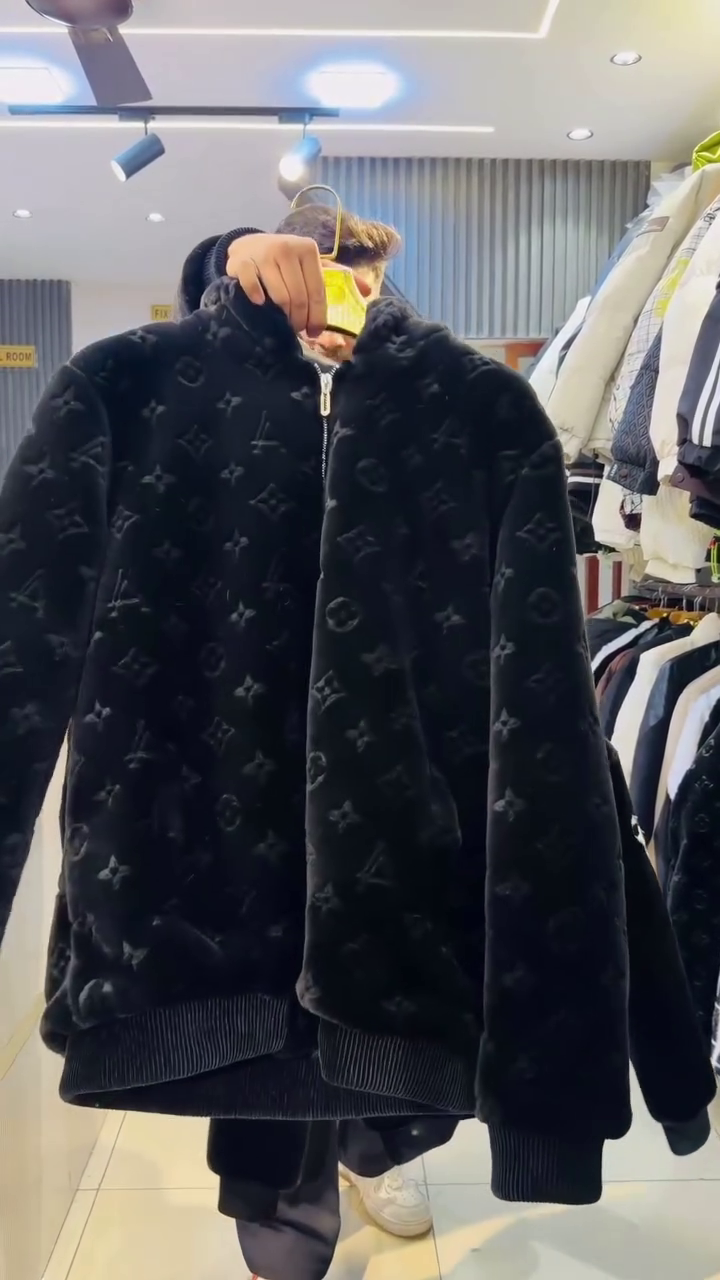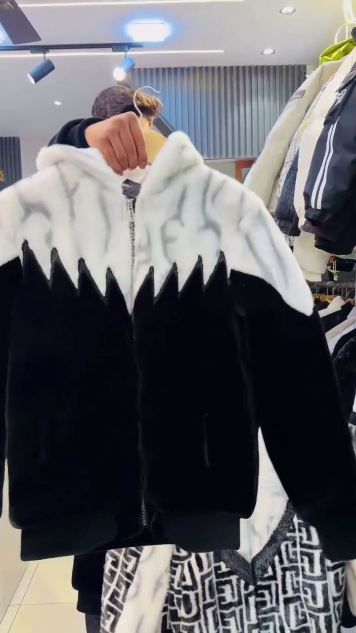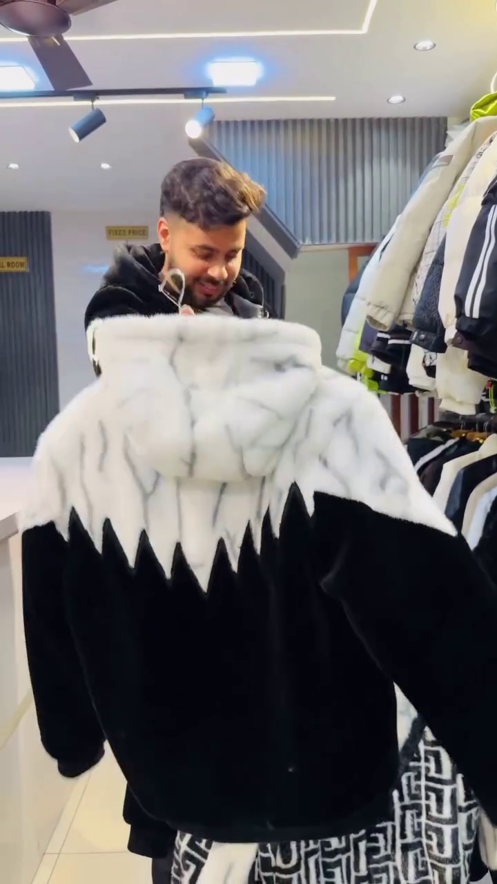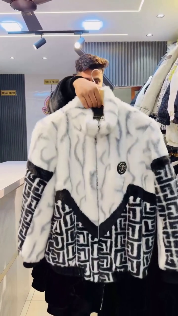 Black & White Faux‑Fur Zip‑Up Winter Jacket with Geometric Panel Detailing and Badge Accent for Men” 🖤🤍