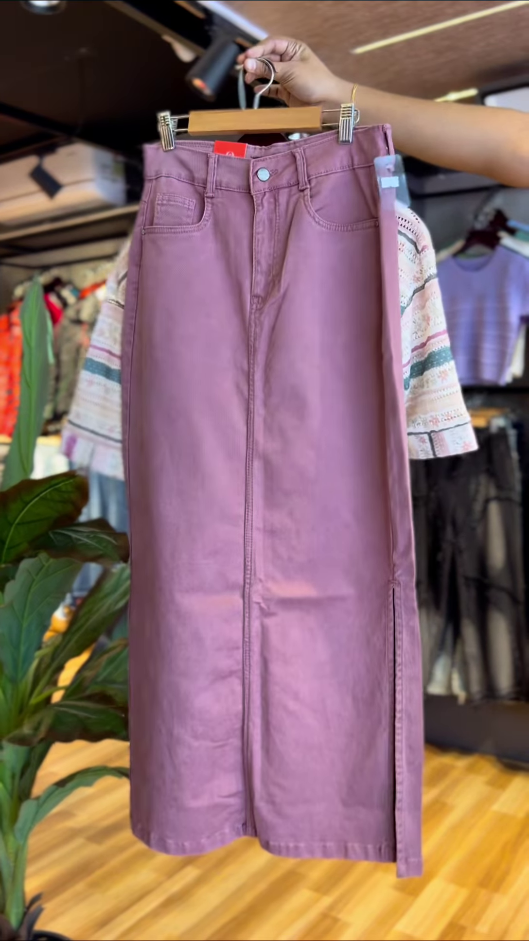 • Mauve high-waisted midi skirt with stitch detail