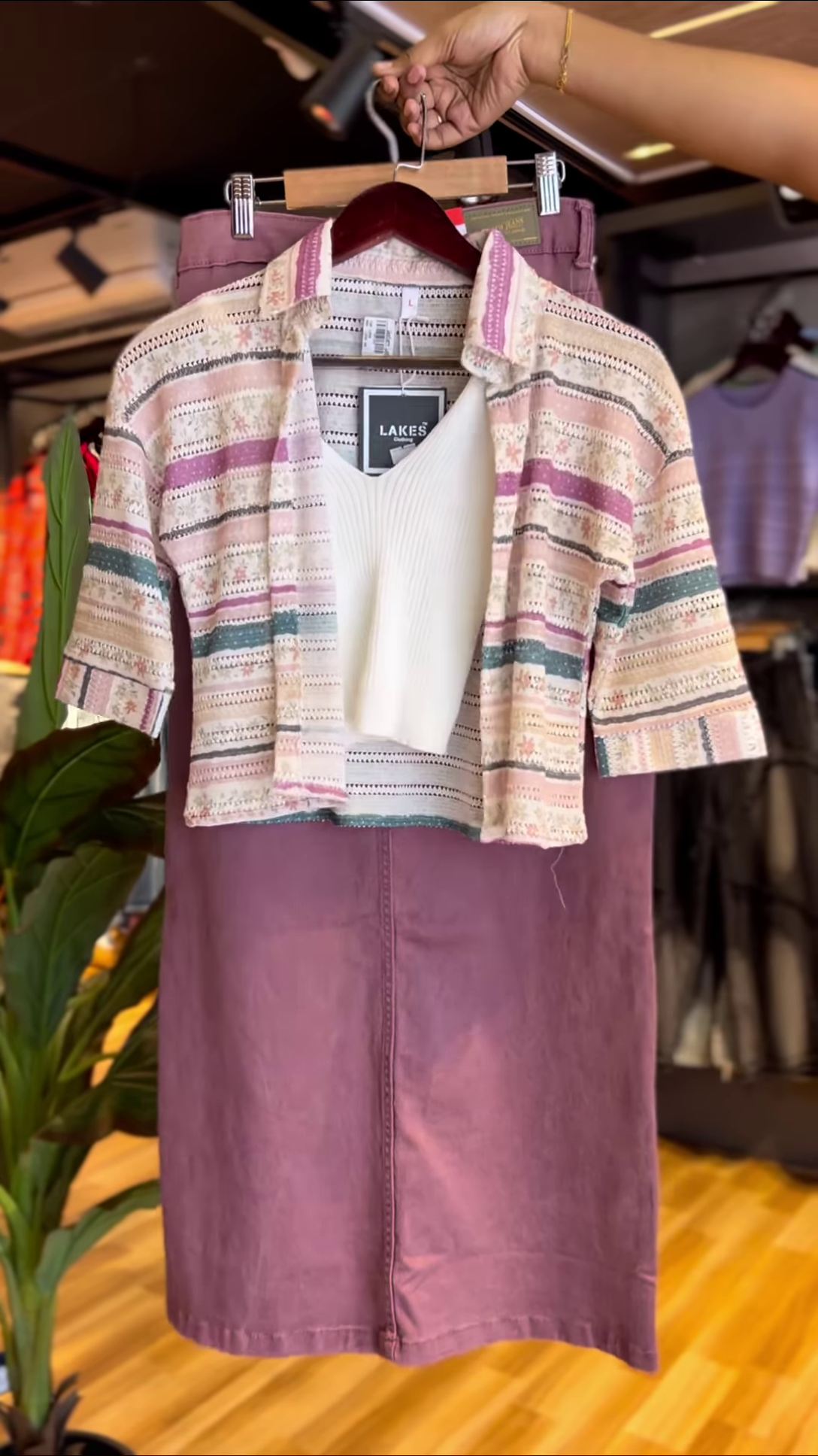 Say hello to your new favorite combo — the Boho Blend Coord Set! This outfit features a creamy ribbed knit tank layered with a cozy, open-front striped crop shirt in earthy tones. Paired effortlessly with a high-waisted mauve midi skirt, this look is a perfect mix of retro flair and modern chill.
