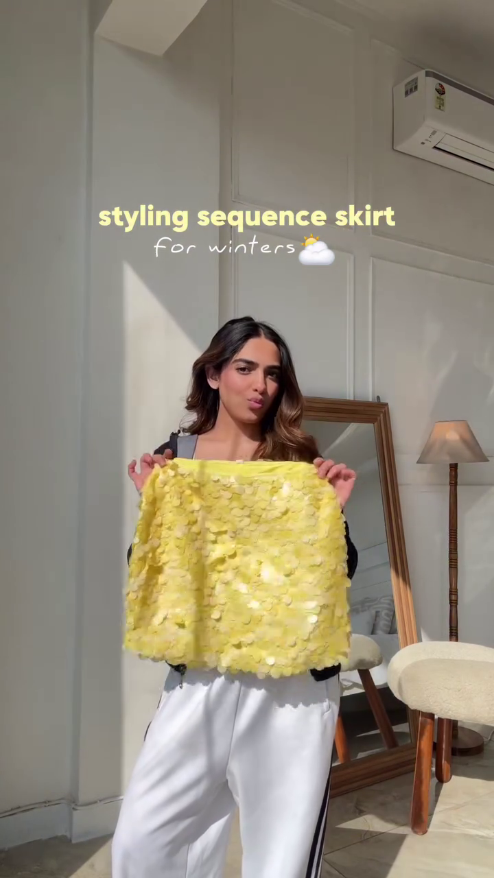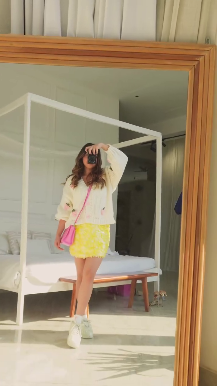 Skirt: Bright yellow mini skirt with layered ruffle/3D petal texture, adding movement and a fun, summery vibe 💛.