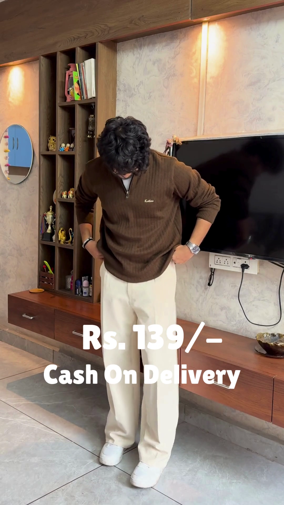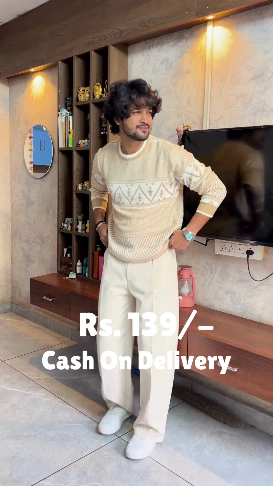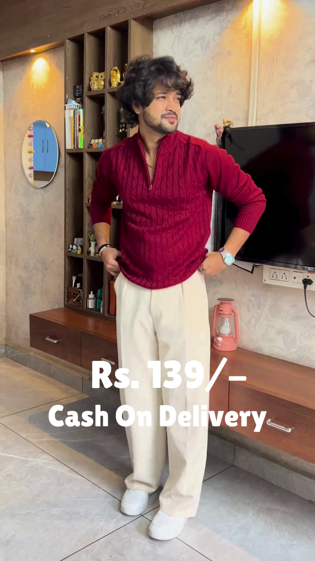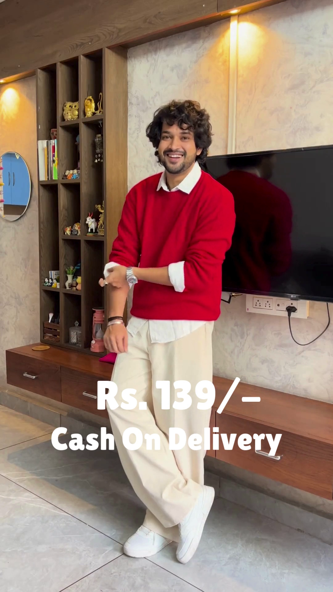 The Crimson Ease outfit is a warm embrace in motion 🔥🤗. A red sweater layered over a white shirt creates a classic contrast 🎨, while cream-colored pants soften the palette with gentle elegance 🤍👖. White shoes ground the look in simplicity 👟🌿, and the subtle sleeve adjustment adds a touch of lived-in charm 💫. Set in a modern room of mirrors, shelves, and warm lighting 🪞🛋️, this look is perfect for festive mornings or reflective evenings. Available in ALL sizes—because comfort and color belong to every soul 🌍❤️.