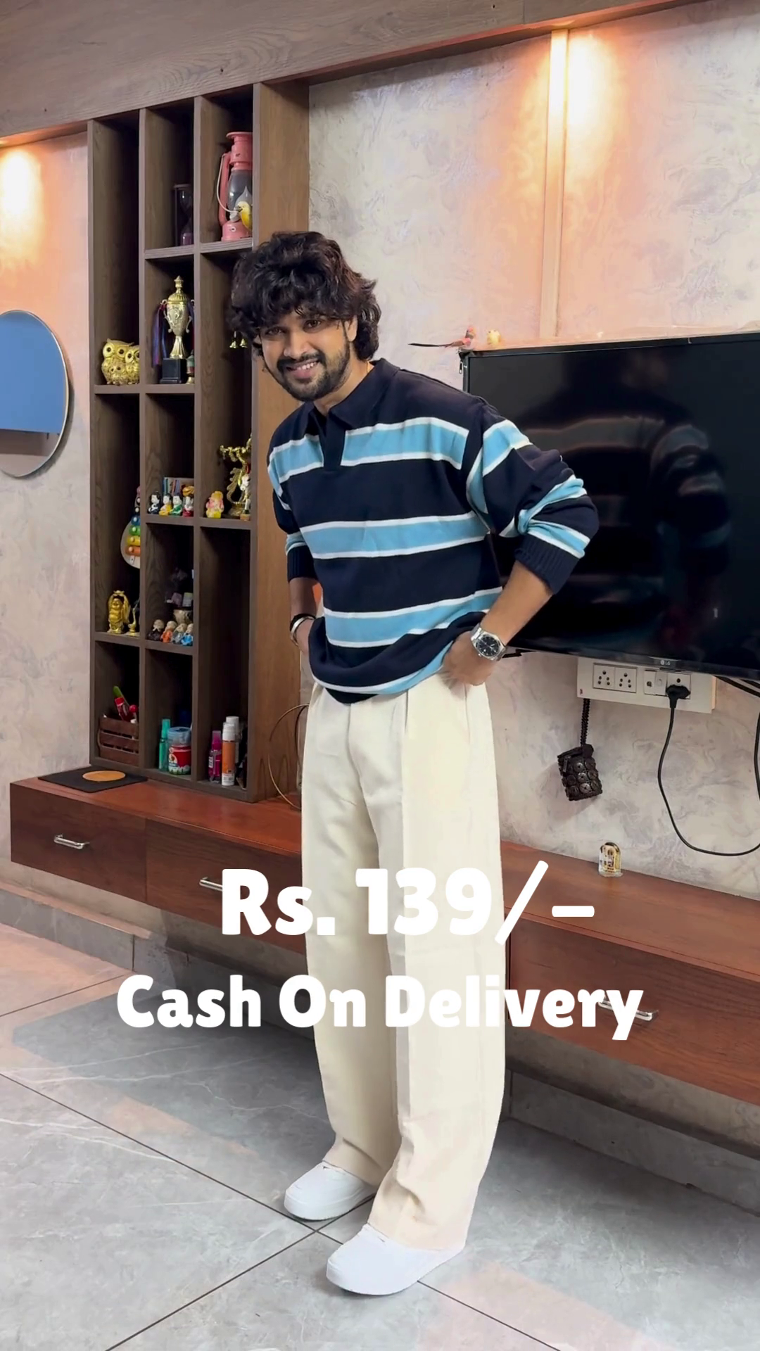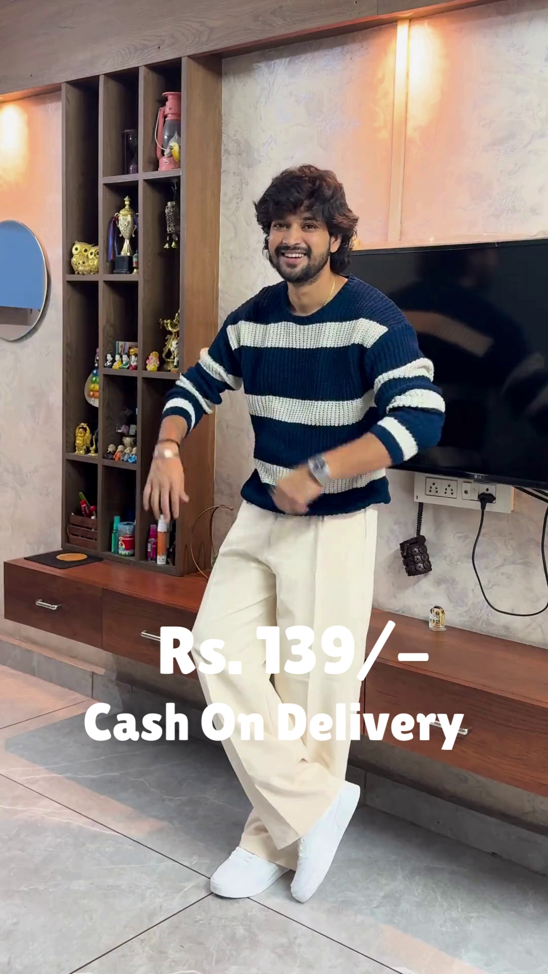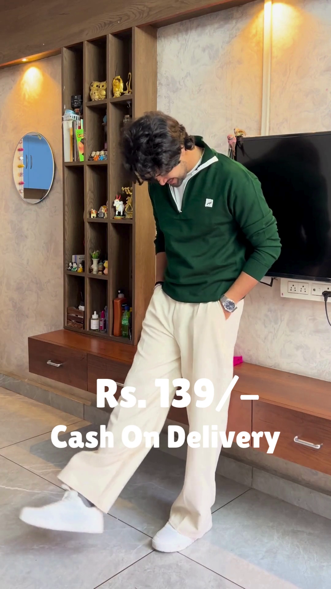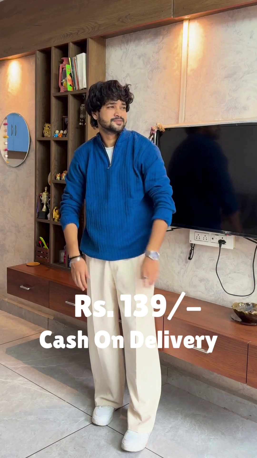 The Crimson Ease outfit is a warm embrace in motion 🔥🤗. A red sweater layered over a white shirt creates a classic contrast 🎨, while cream-colored pants soften the palette with gentle elegance 🤍👖. White shoes ground the look in simplicity 👟🌿, and the subtle sleeve adjustment adds a touch of lived-in charm 💫. Set in a modern room of mirrors, shelves, and warm lighting 🪞🛋️, this look is perfect for festive mornings or reflective evenings. Available in ALL sizes—because comfort and color belong to every soul 🌍❤️.