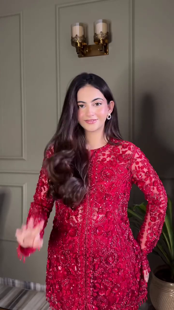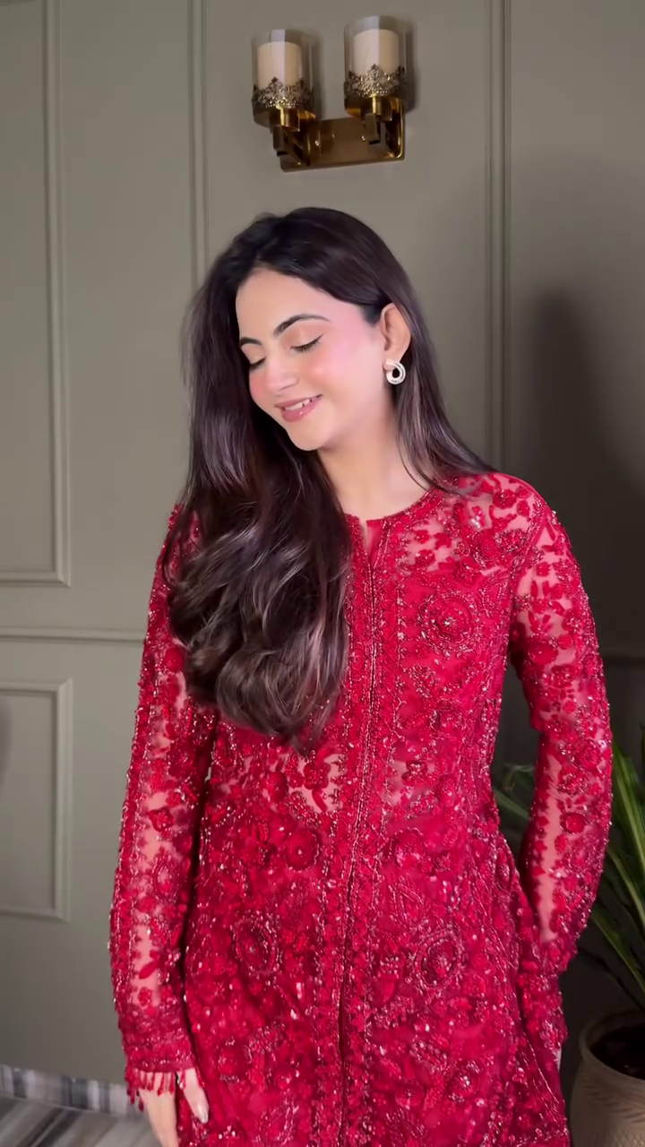 Kurta: Long straight kurta in rich red, densely embroidered and beaded from neckline to hem and sleeves, giving a luxe, sparkling finish ✨.