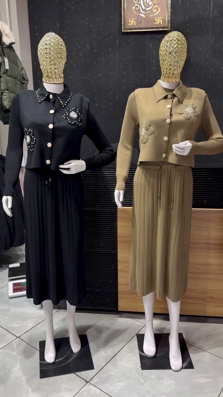 This elegant golden beige knit co‑ord set 💛 brings a sophisticated touch to winter wardrobes. The top is a structured knit jacket‑style sweater with long sleeves and a classic collar. Pearl‑like bead detailing decorates the collar and front placket, while delicate floral embellishments on the chest elevate the look with subtle sparkle ✨. The matching long skirt features vertical ribbed pleats and a drawstring waist for comfort and adjustability. Together, they create a graceful, elongated silhouette perfect for parties, family gatherings, or semi‑formal outings. The soft knit fabric provides warmth without feeling too heavy, making it ideal for cooler months. Pair this set with heeled boots or pumps, a clutch, and minimal jewelry to let the embellishments stand out.