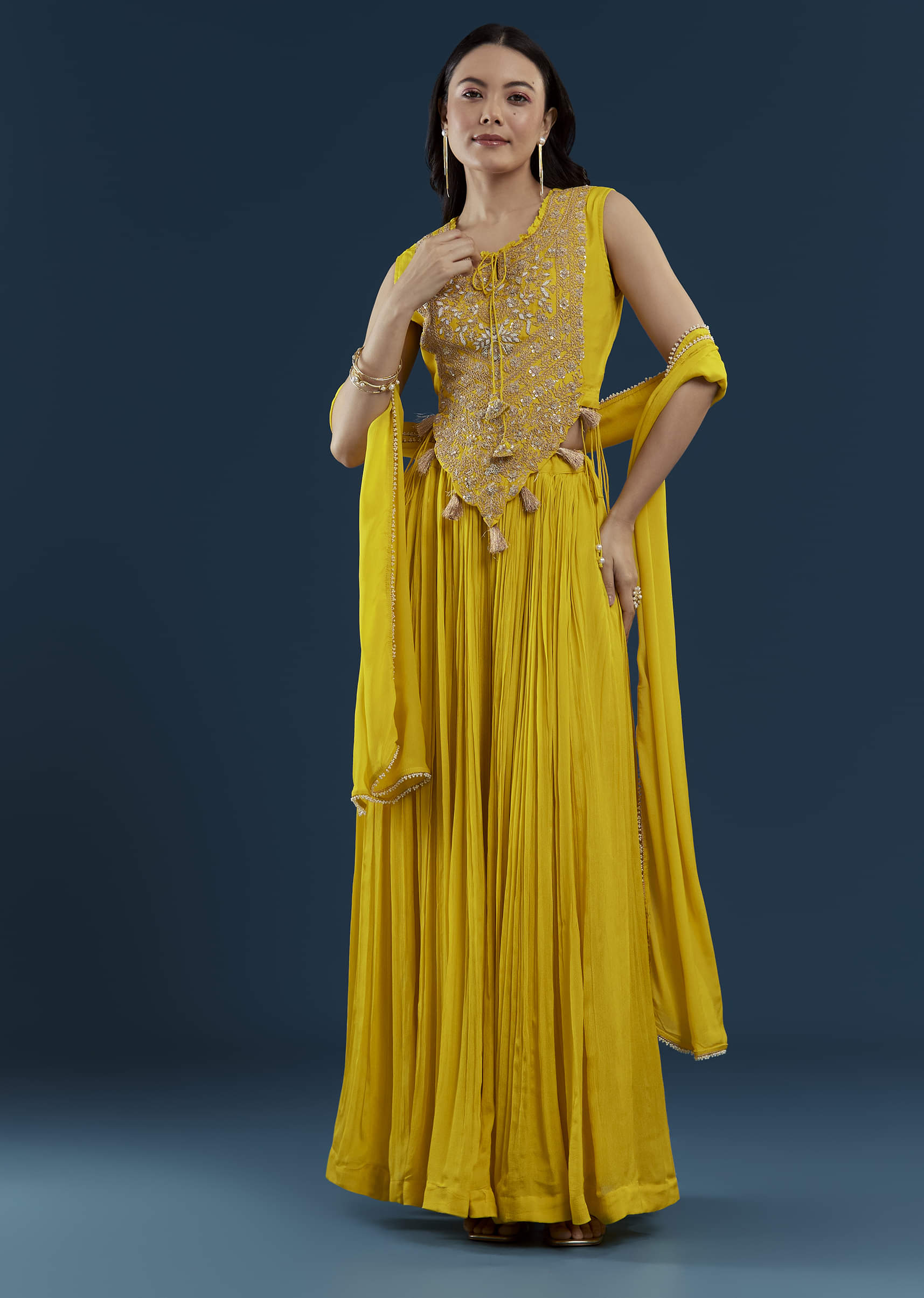 A vibrant marigold yellow lehenga set crafted for twirl‑worthy moments at weddings and festive celebrations.
