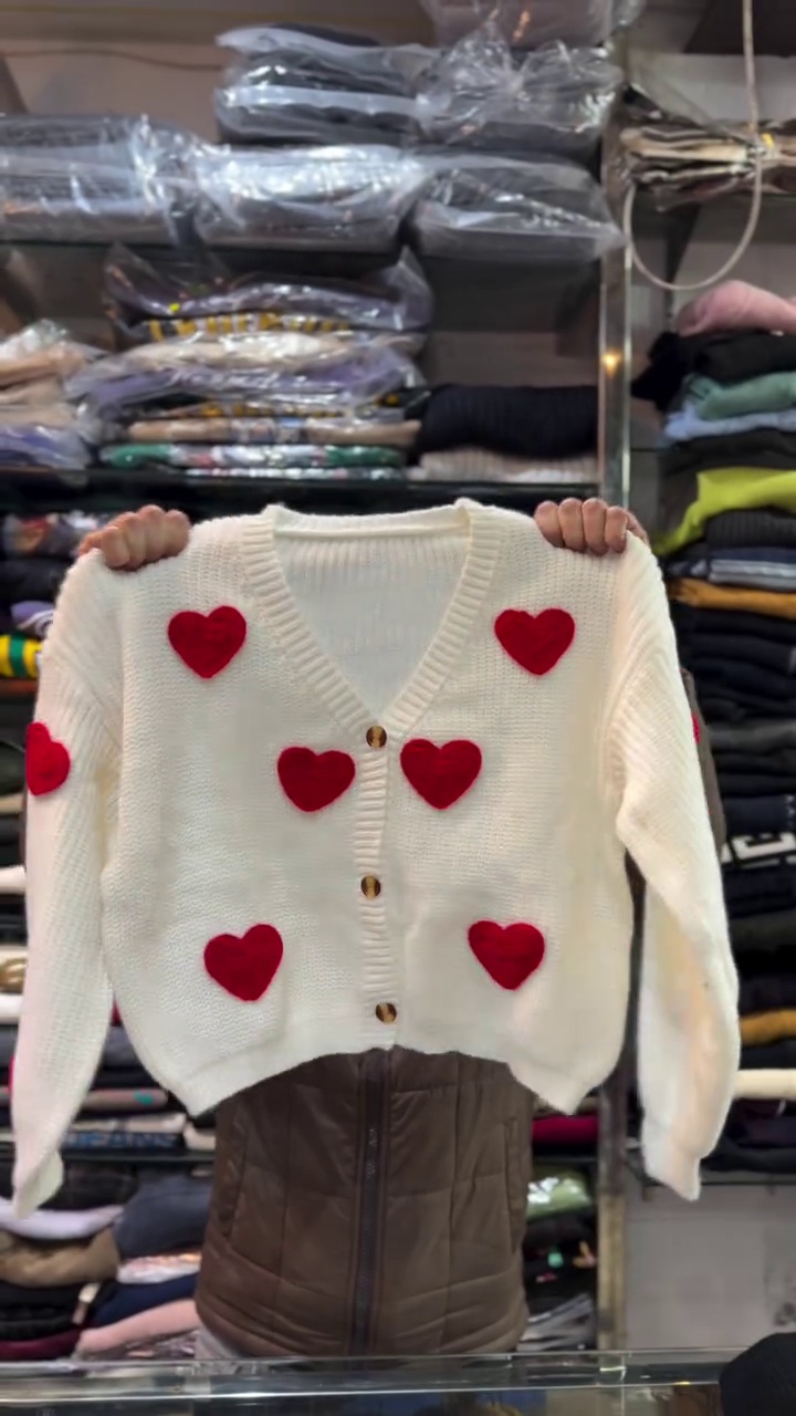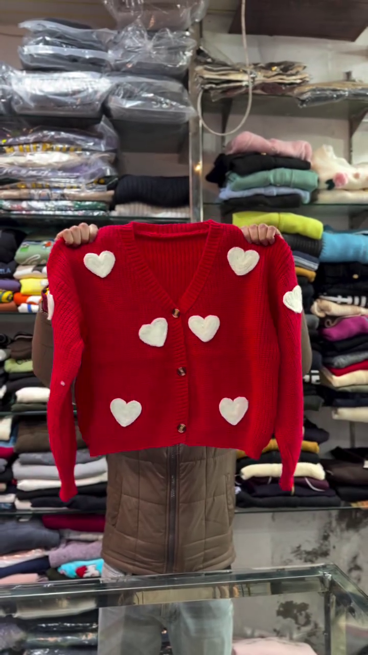 Wrap yourself in love with this red knitted cardigan, sprinkled with white heart patches like confetti of affection 💌🧥. The V-neck design and brown buttons add vintage charm, while the symmetrical heart layout brings balance and whimsy 🎯💘.