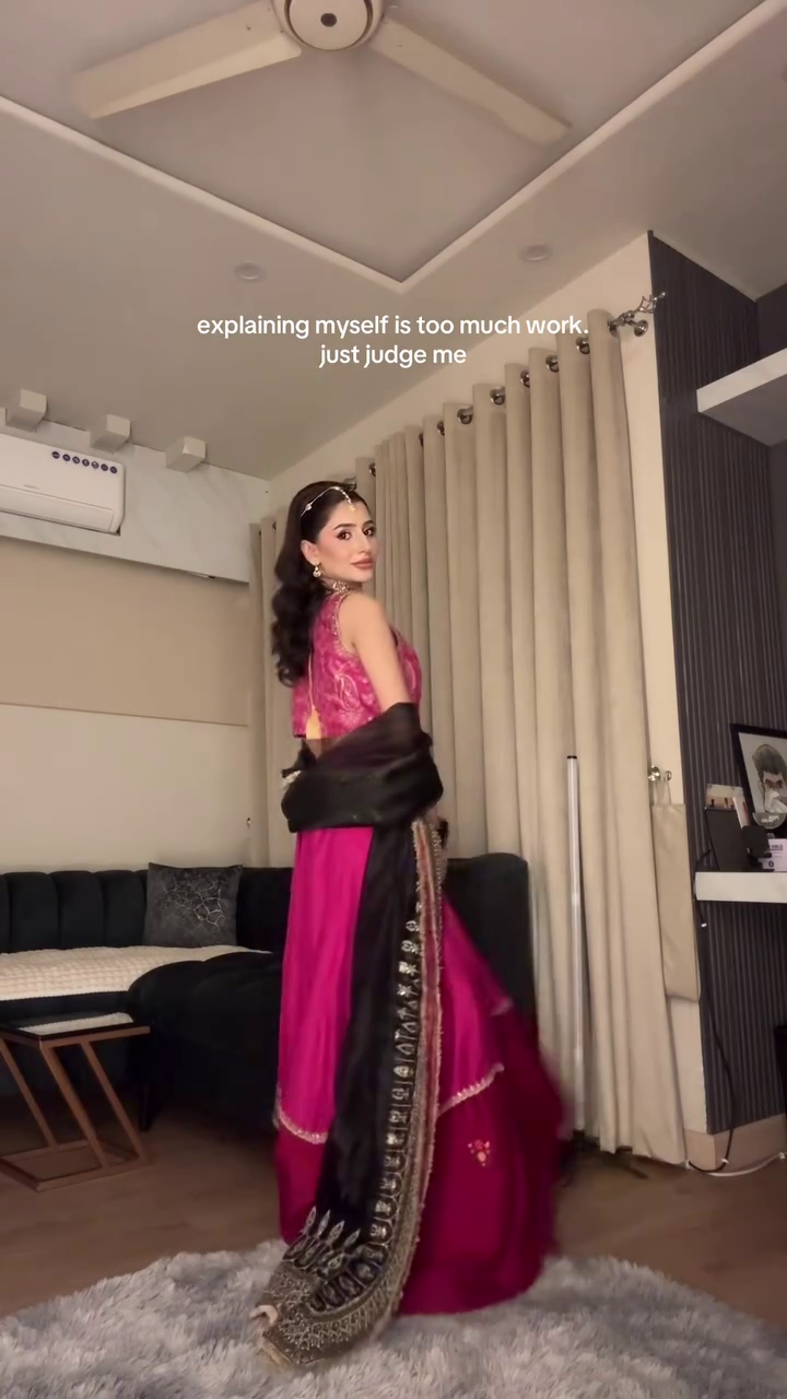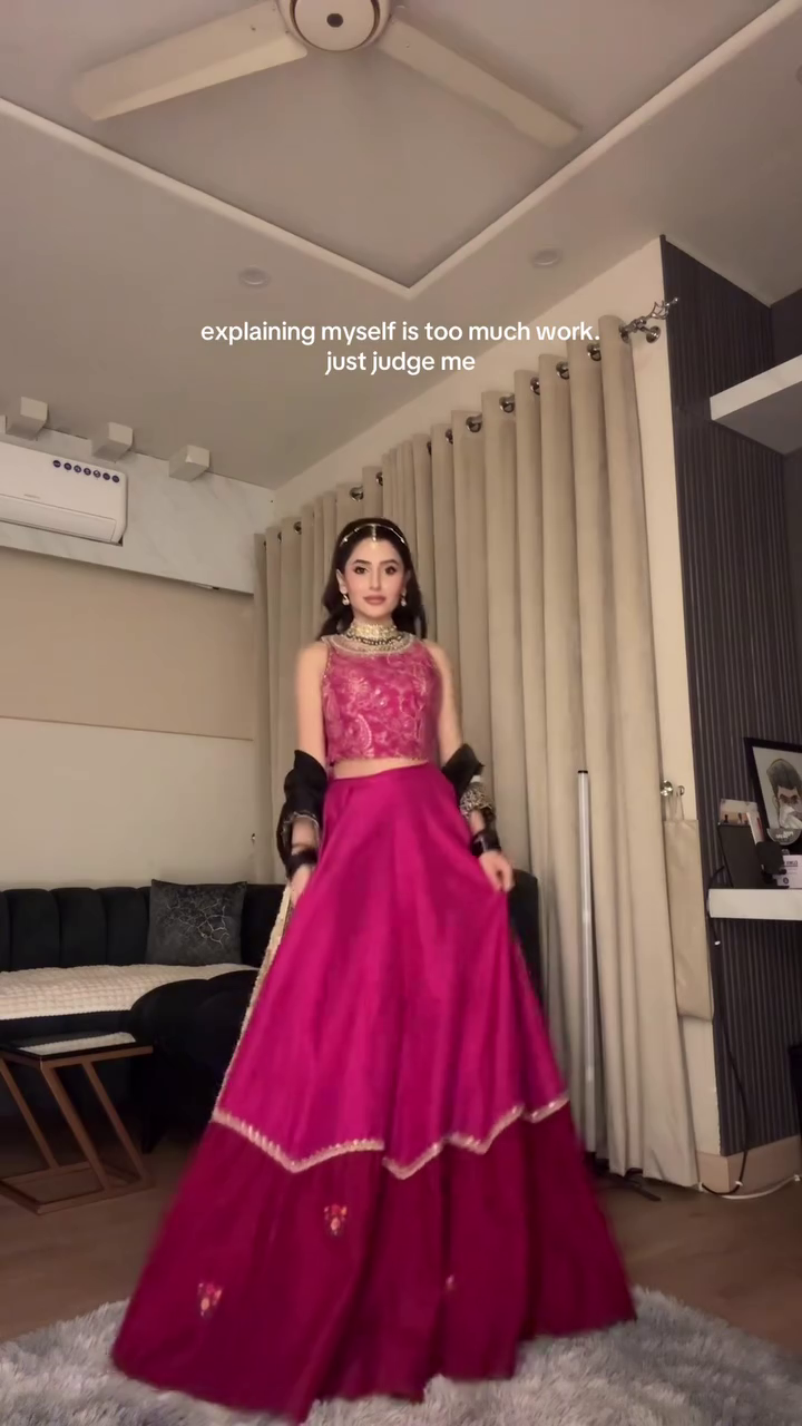 - Outfit details: Fitted sleeveless blouse with intricate tone‑on‑tone embroidery paired with a dramatically flared lehenga skirt in rich magenta, finished with a delicate golden border at each tier ✨.