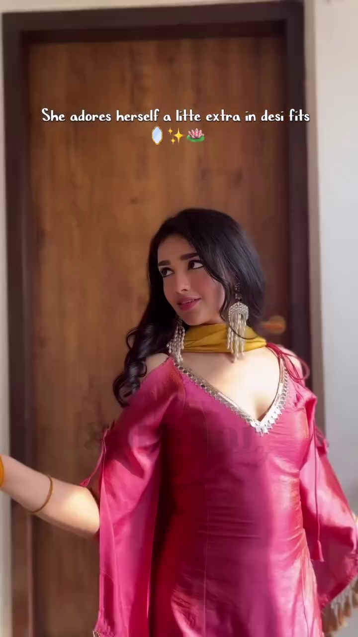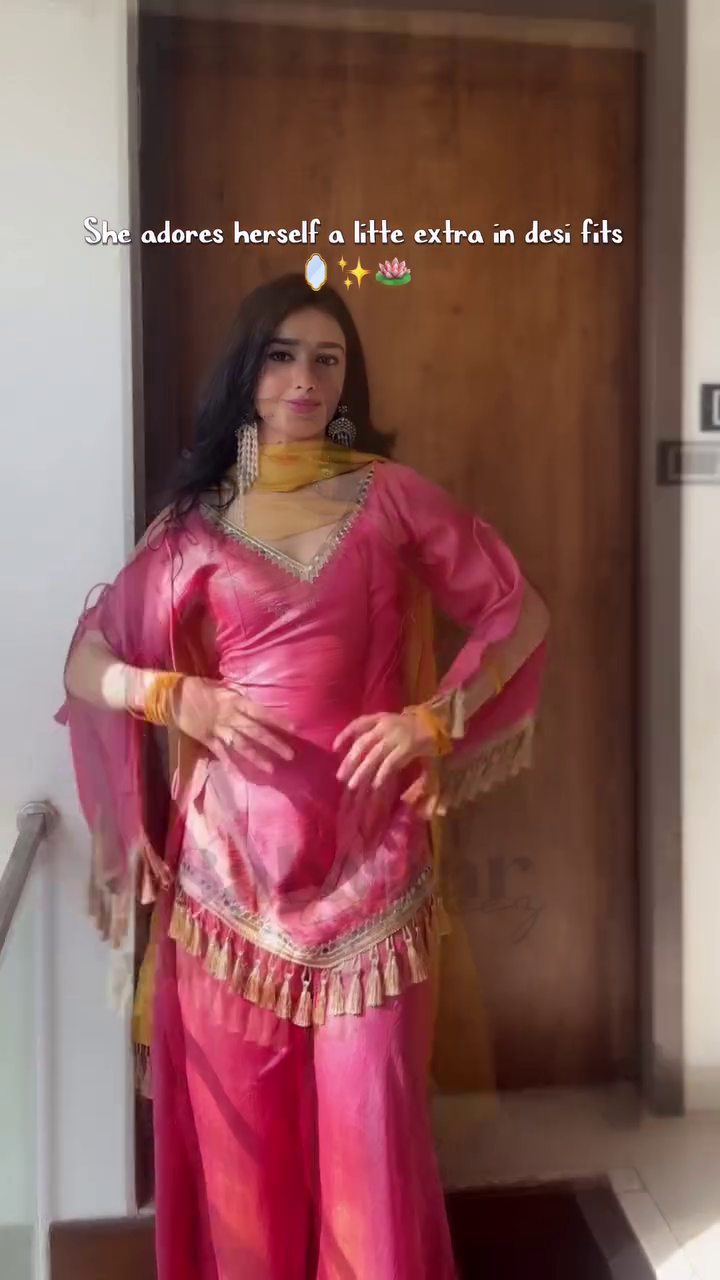 Kurta: Short V‑neck kurta with sheer flared sleeves and metallic tassel trim along the hem, giving lots of movement and sparkle ✨.