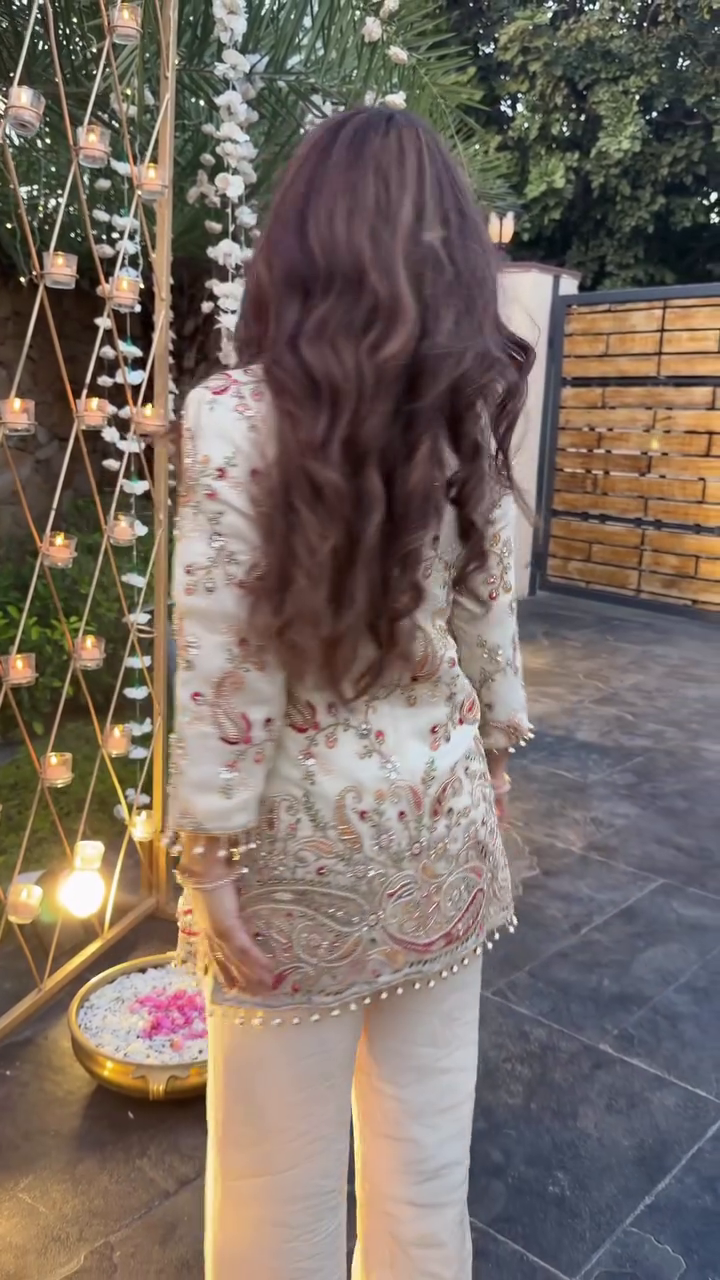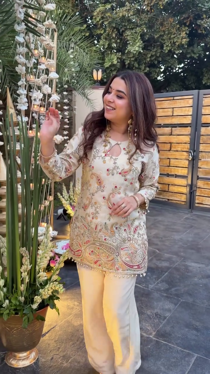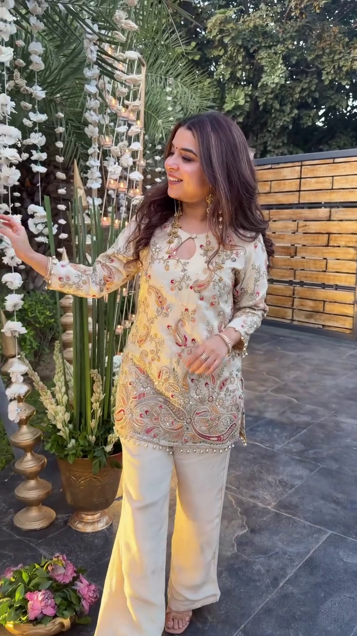 The kurti has a stylish keyhole neckline and pairs beautifully with straight palazzo pants. It gives a classy, minimal yet festive vibe.