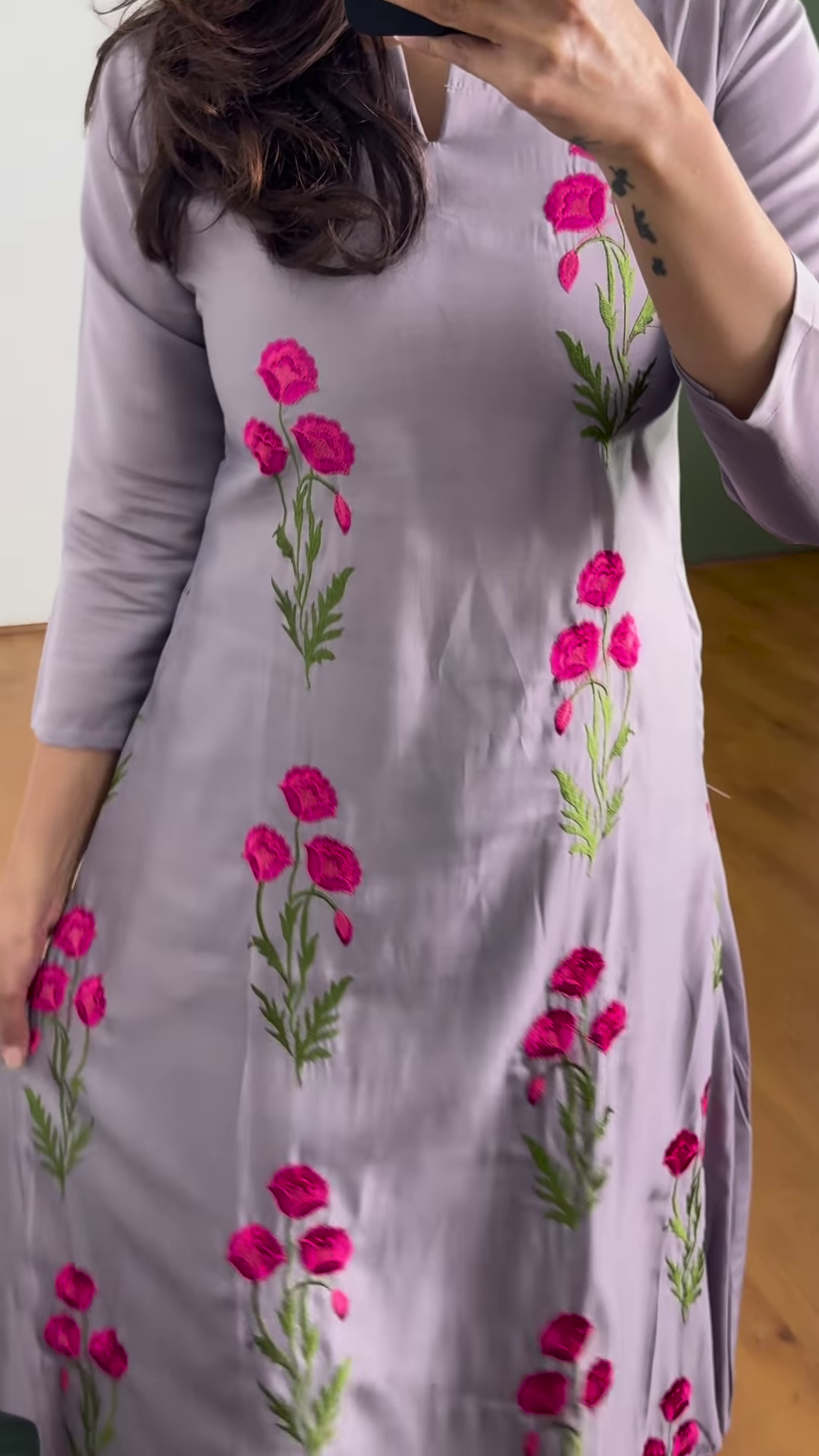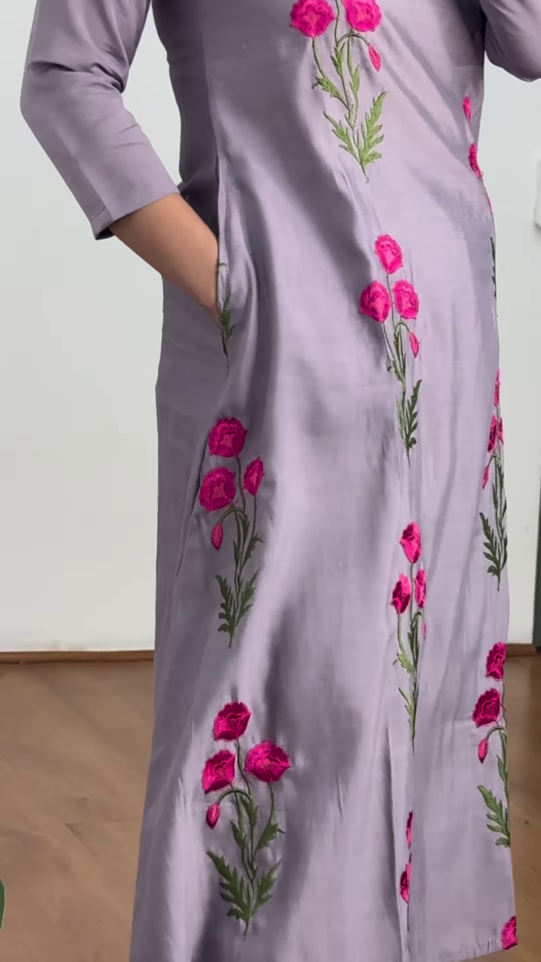 Embrace timeless elegance with this lavender embroidered kurti, a perfect blend of traditional charm and contemporary grace. Crafted from a smooth and flowy fabric that feels luxurious on the skin, this kurti features exquisite hot pink floral thread embroidery that runs verticallyβ€”adding a pop of vibrant color to a soft pastel base.