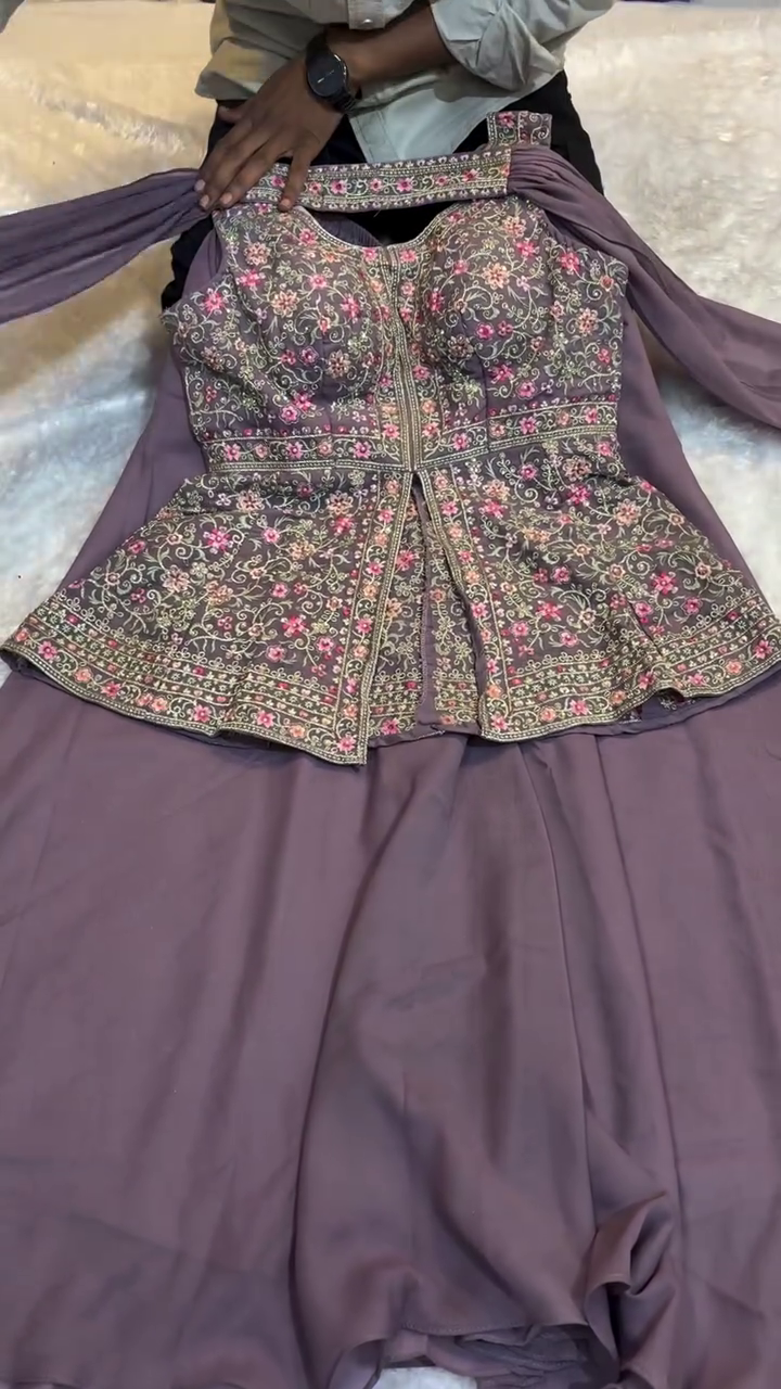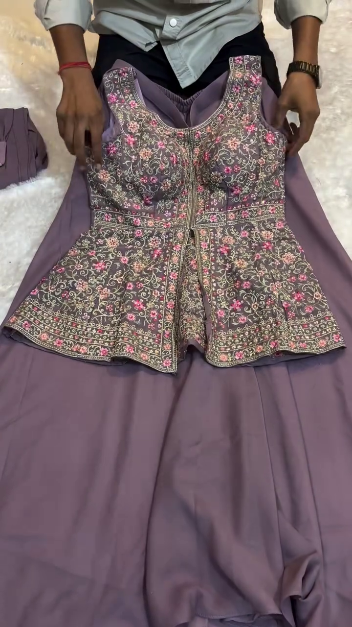 💜 The Lavender Mauve Heavy Embroidered Peplum Kurti and Skirt Set is an opulent blend of classic Indian embroidery and contemporary silhouette! This statement set features a structured peplum-style kurti in soft lavender mauve, heavily adorned with intricate zari, sequin, and multicolored floral threadwork all over the bodice and hem. The metallic zipper at the front gives a modern edge while still celebrating rich craftsmanship.