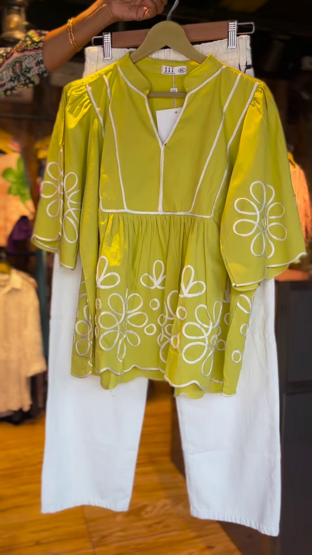 Make room for color and comfort with the Lime Bloom Set! This peppy lime green peplum top with bold white floral appliqué work is pure joy in fabric form. With a flattering empire waistline and flowy silhouette, it’s perfect for twirling through your day. The set is paired with easygoing white cotton pants – giving it the perfect balance of drama and simplicity.