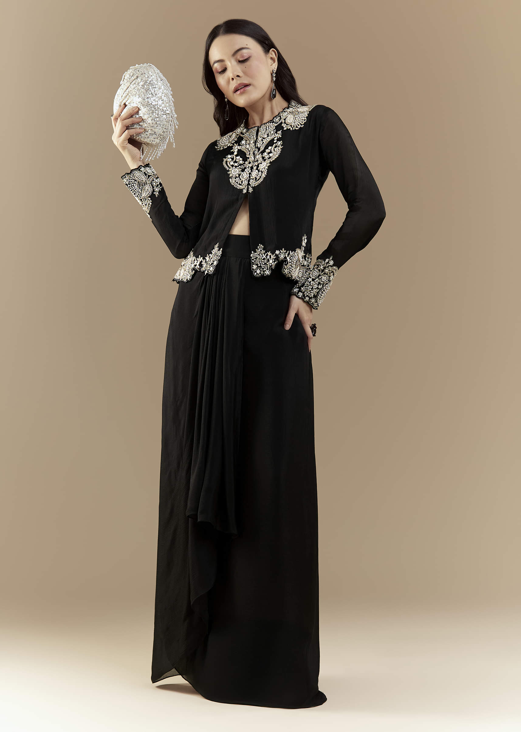 On top, a long‑sleeve front‑open jacket acts as both blouse and overlay. It is richly embellished with silver embroidery and sparkling details across the neckline, waist, and cuffs, drawing attention to the upper body and adding a regal touch.