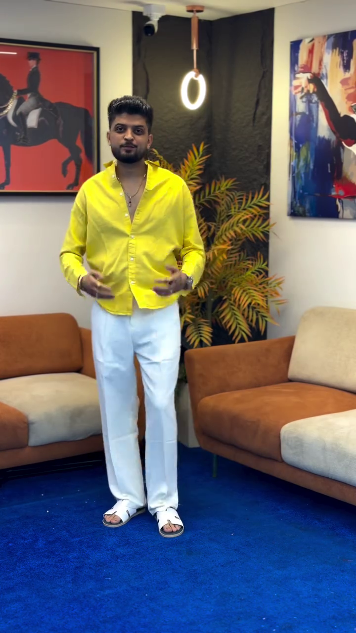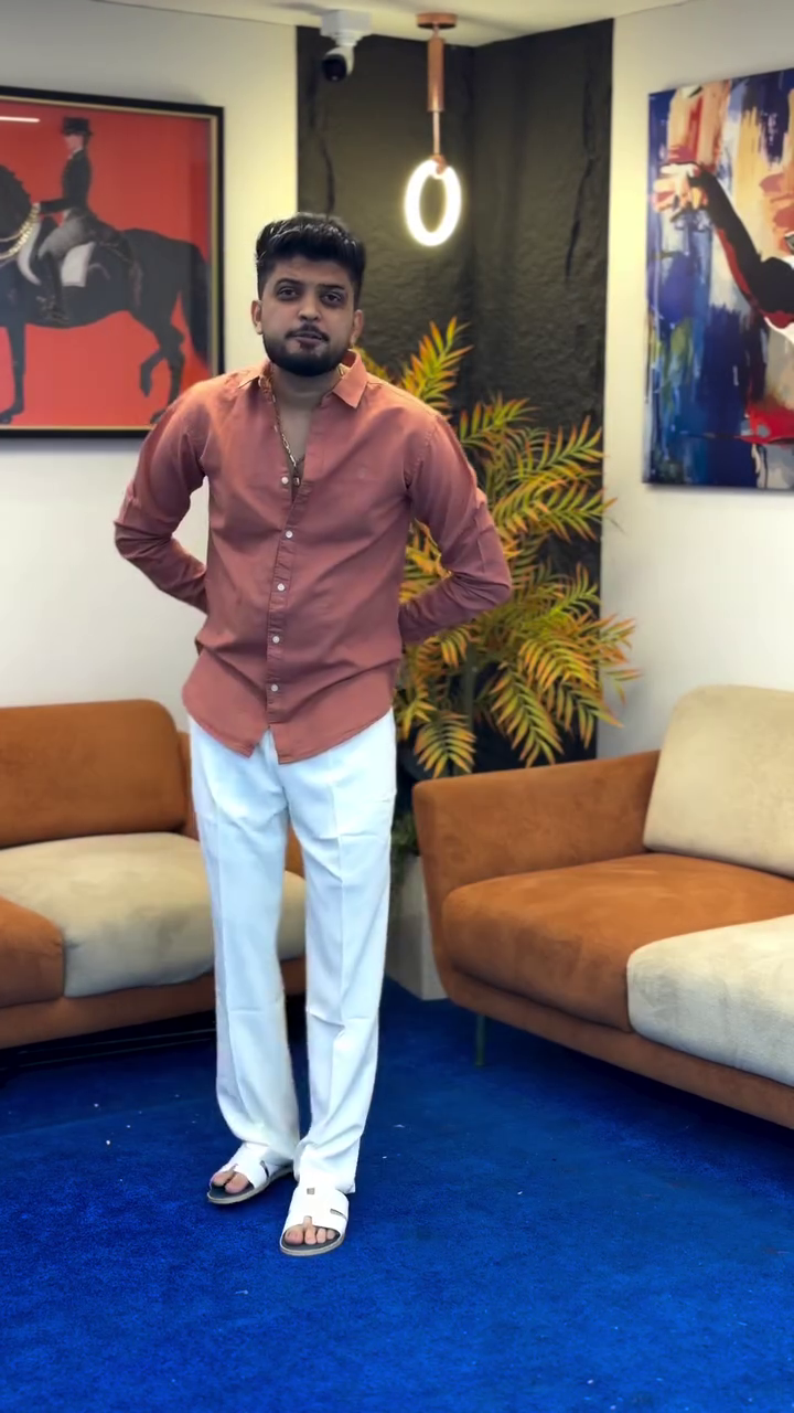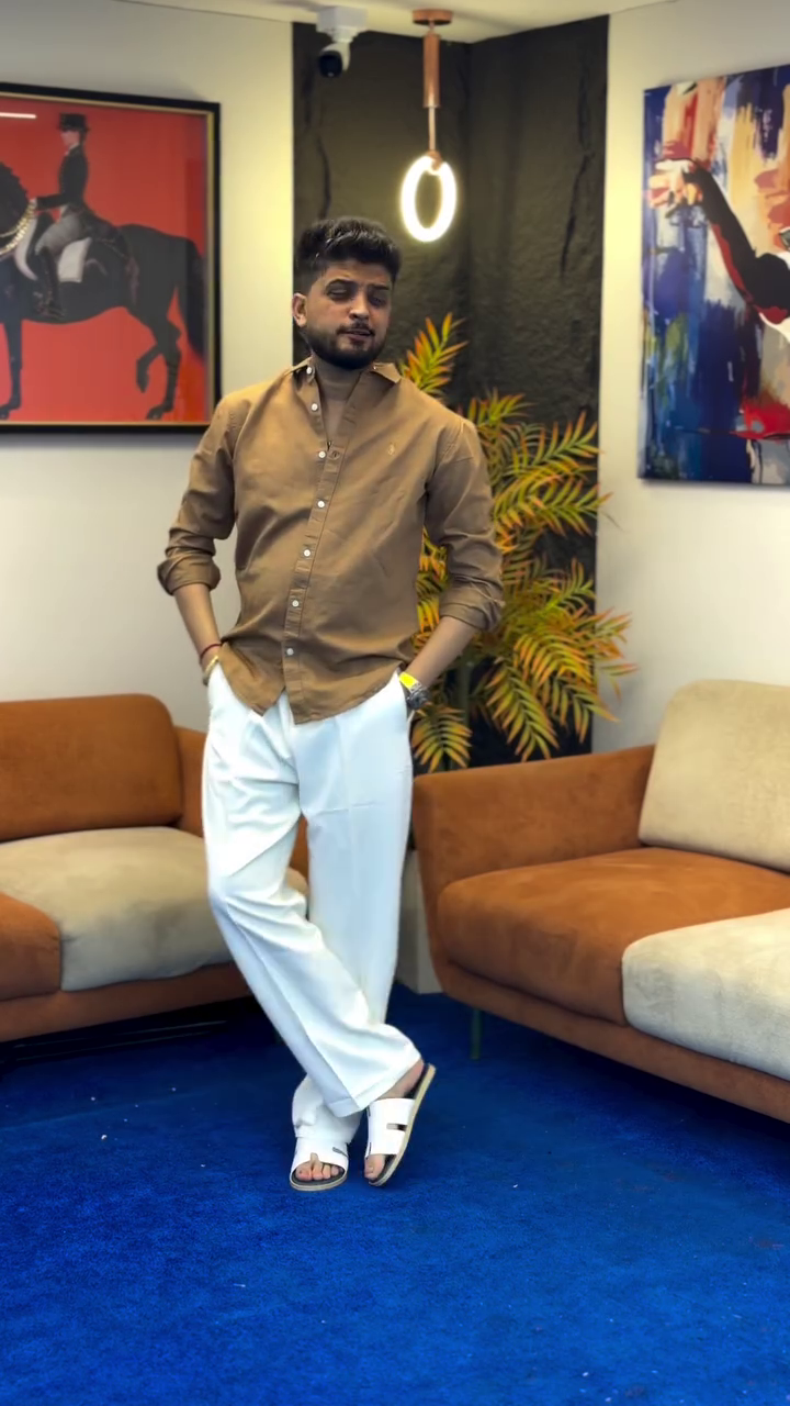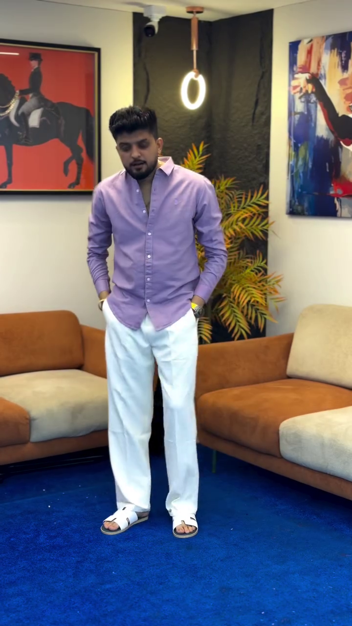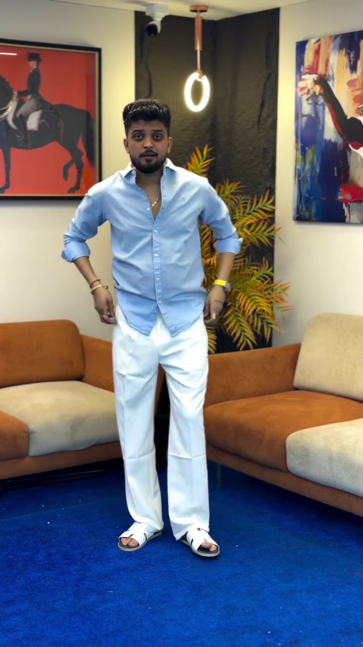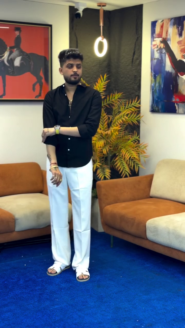 Elegance meets ease in this black button-up shirt paired with crisp white trousers and sandals πŸ–€πŸ‘–. The look is minimalist yet magnetic, perfect for stylish lounging or gallery strolls πŸŽ¨πŸ›‹οΈ. The room’s vibrant blue carpet and abstract art echo the outfit’s balance of calm and creativity πŸŒ€πŸ–ΌοΈ.