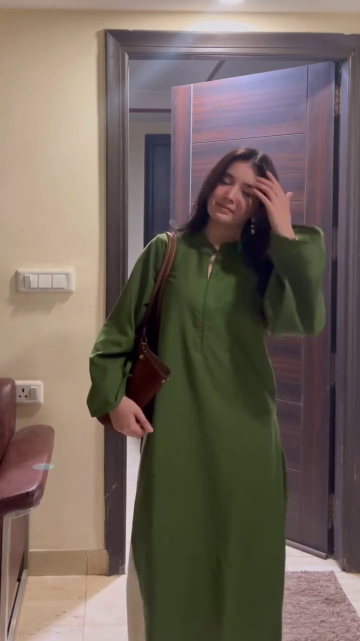• Design: Simple, elegant long kurta dress in a rich olive green shade, featuring a clean neckline with a small V‑slit and full sleeves for modest yet stylish coverage 🤎.