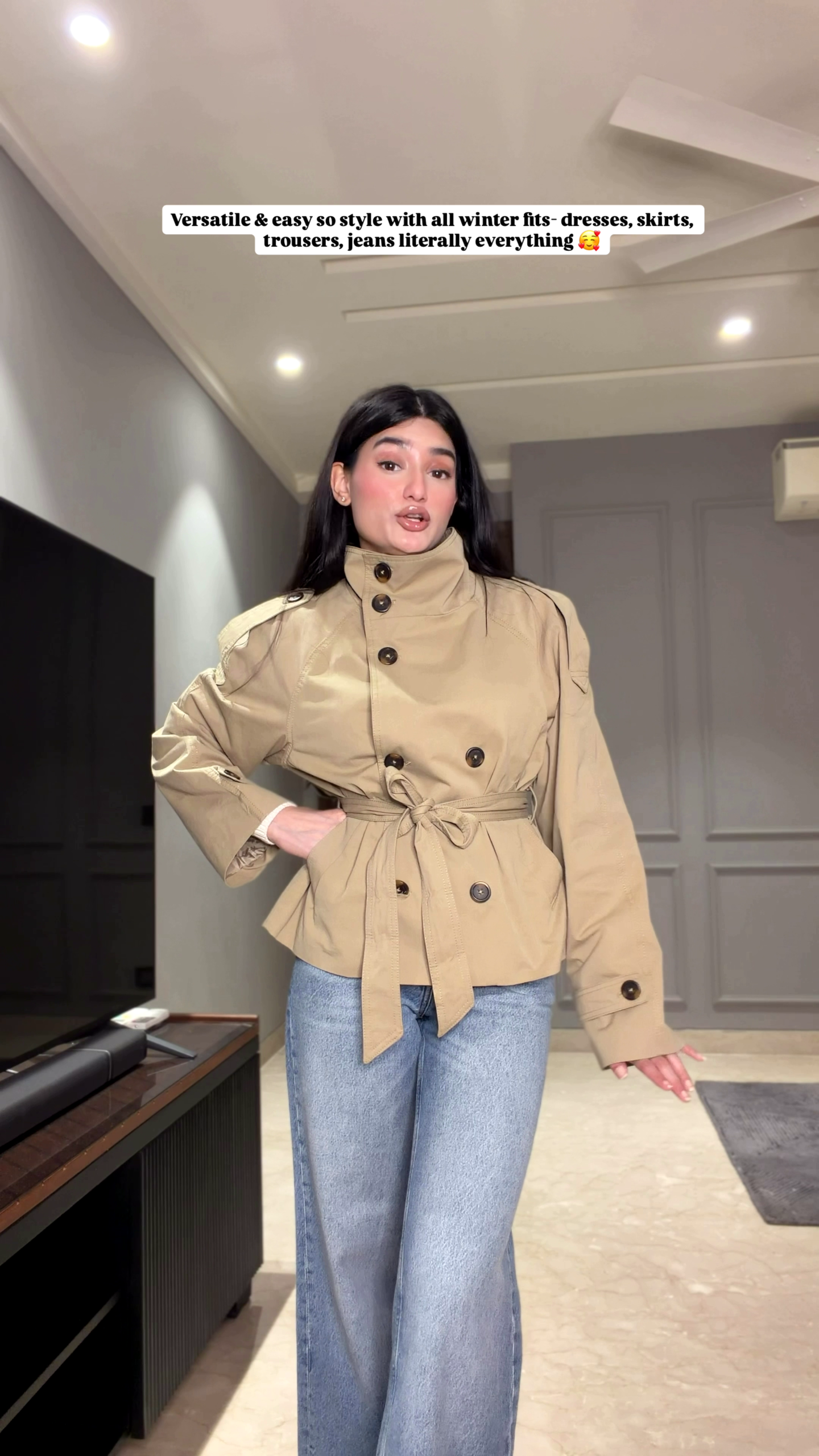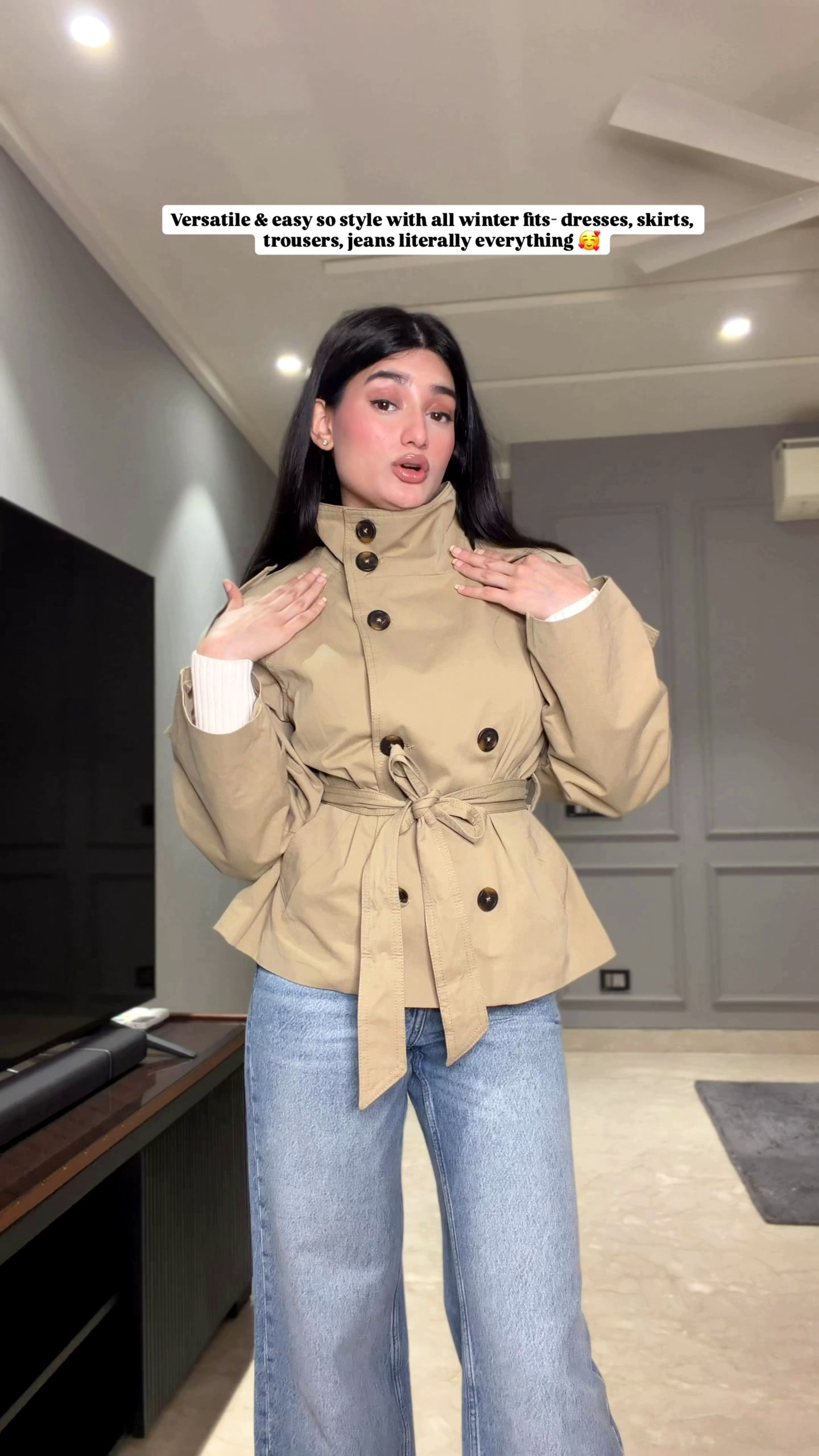 Design: Classic trench‑inspired short jacket in a versatile sand beige tone, featuring broad lapels, storm‑flap style front and dark contrast buttons for a structured yet relaxed look 🤎.