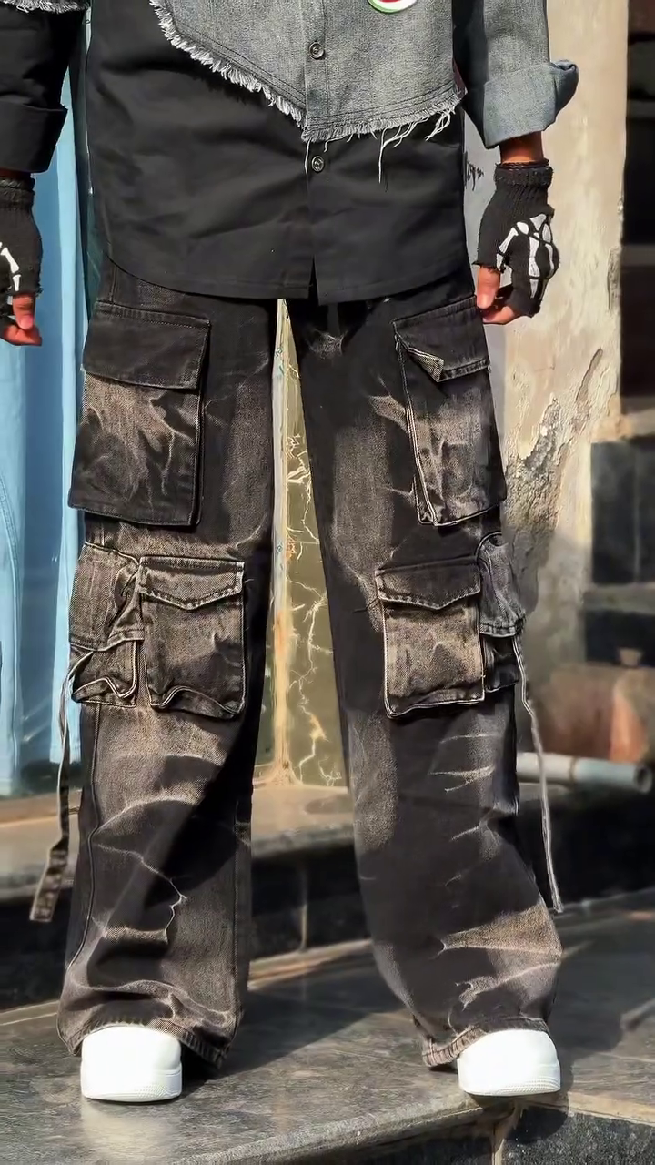 Command the streets in these black cargo pants with a distressed wash and oversized flap pockets πŸ™οΈπŸ‘–. The drawstring details and rugged texture scream functionality with flair, while the layered top and skeleton gloves add a rebellious twist πŸ’€πŸ§₯.
