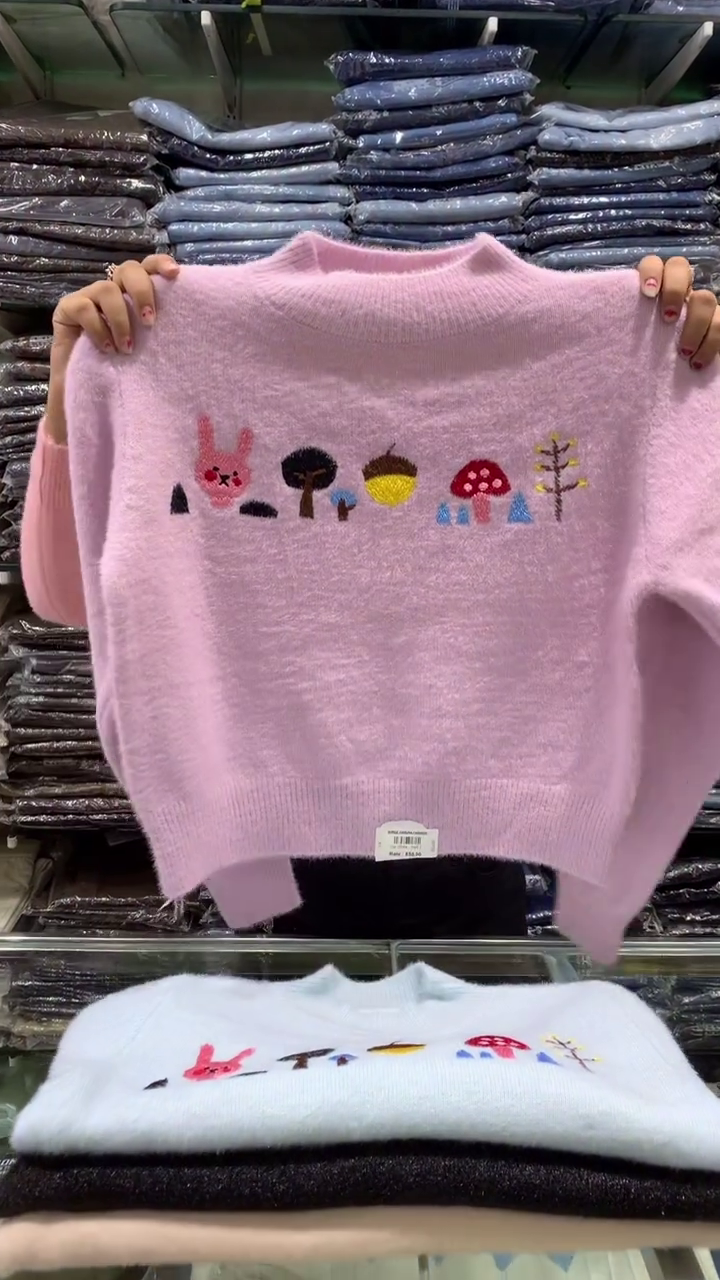 ๐ŸŽจ Brighten your childโ€™s day with this ultra-soft, pastel pink sweater adorned with cute animal and tree embroidery!