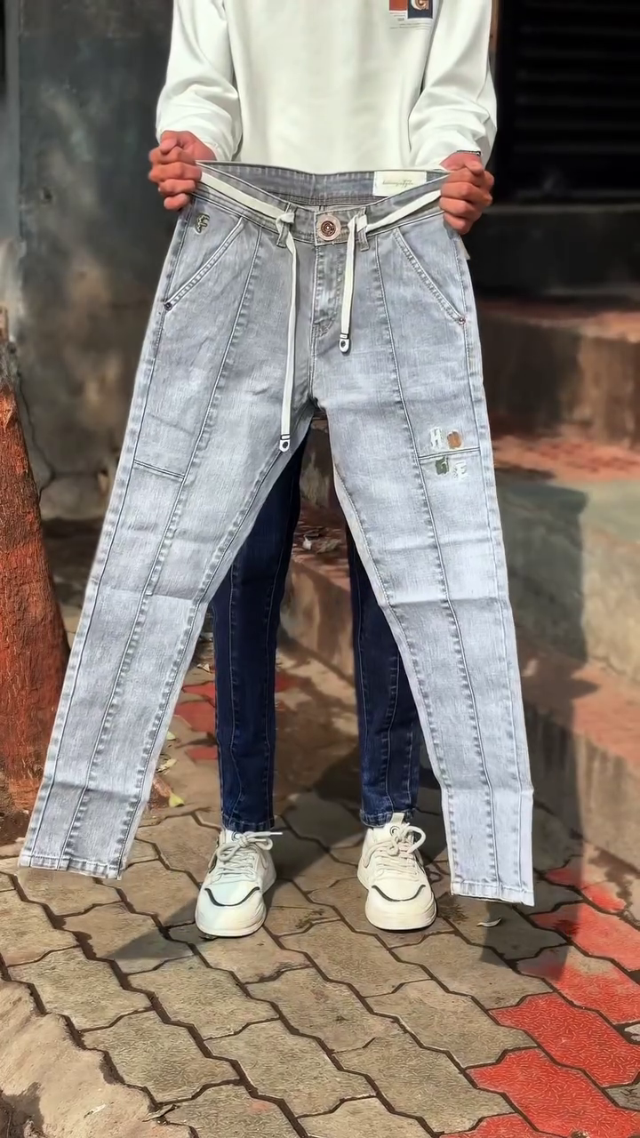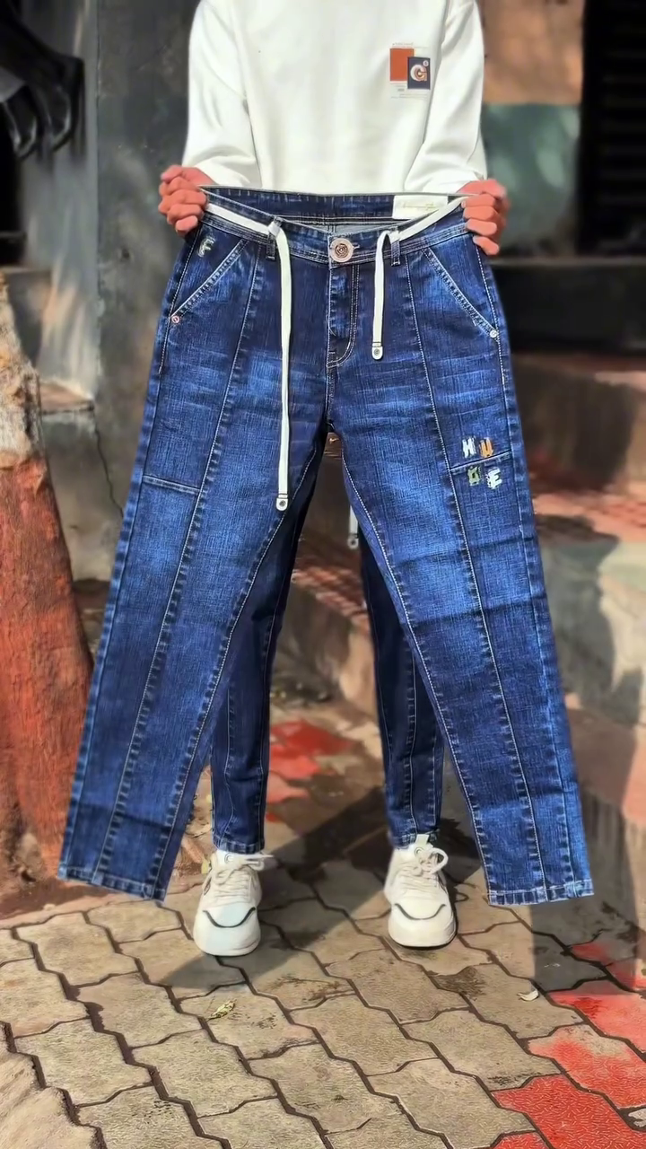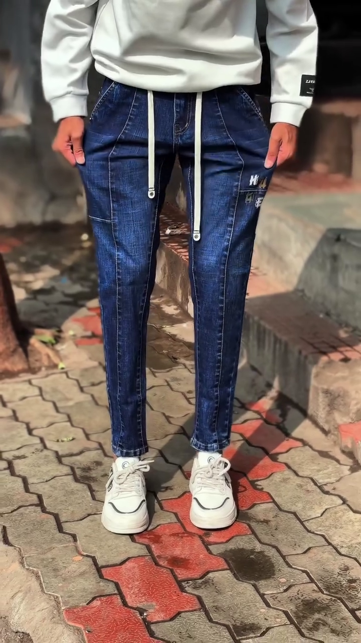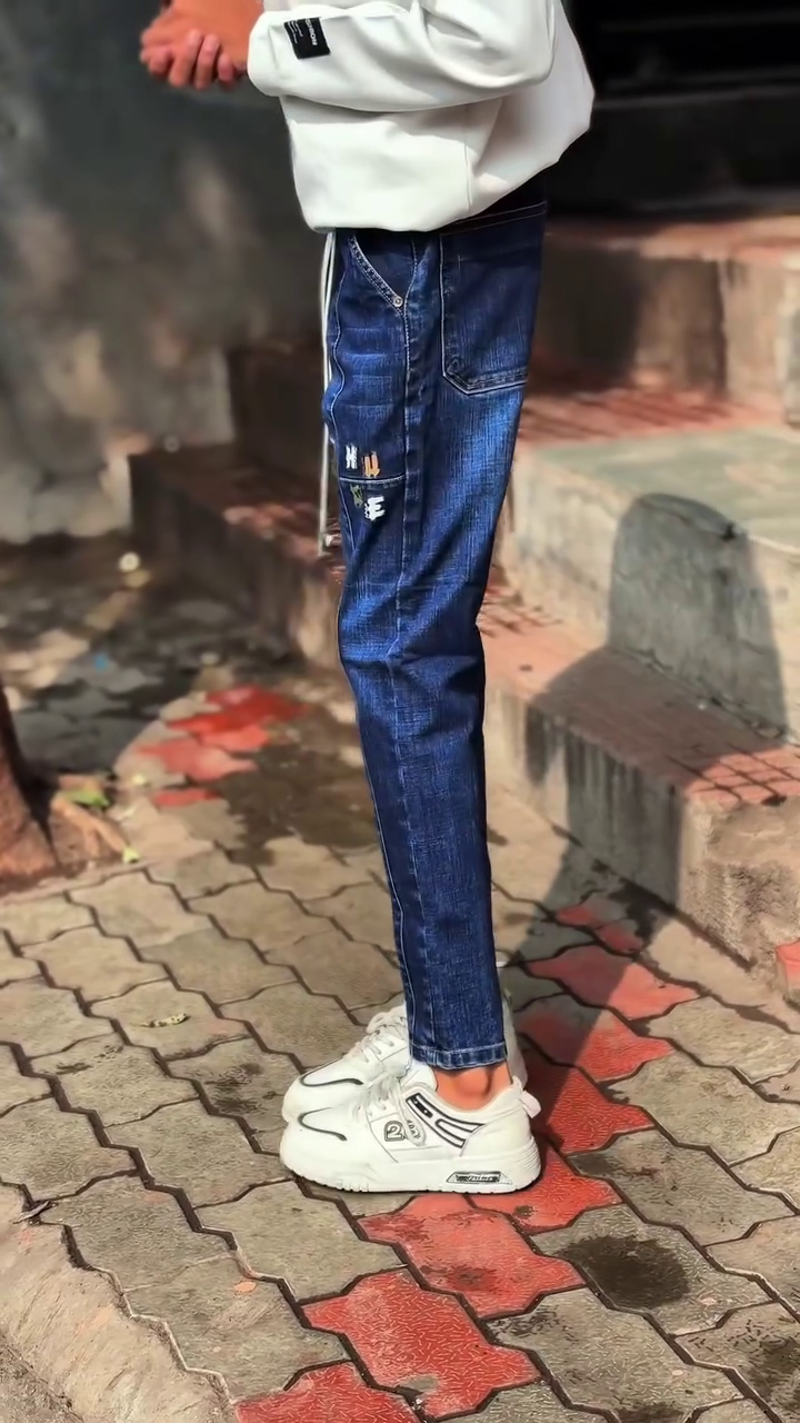 Make a statement in these blue denim joggers with bold stitching, side pockets, and printed thigh text πŸ–‹οΈπŸ‘–. The drawstring waist and tapered fit offer comfort without compromise, while the white sneakers and sweatshirt balance the look with brightness πŸ€πŸ‘Ÿ.